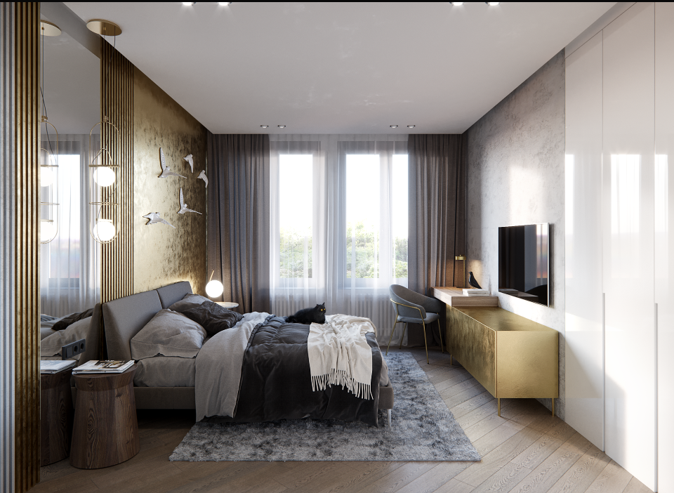 主卧墙面刷上了淡淡的橘粉色,温暖却不过于艳丽,与白色搭配起来,显得清丽淡雅。原木地板尽显高级大气。床头利用衣柜与墙的转角空间,设计了悬空床头桌,满足了女业主化妆和男业主打游戏的双重需求。卧室空间虽不大,但只要合理利用,就能实现空间扩容。主卧的软装比硬装更出彩。百褶曲线落地灯充满了网红中古风,花朵造型的主灯与一侧壁灯设计感十足,为整个卧室增添了独特的魅力。