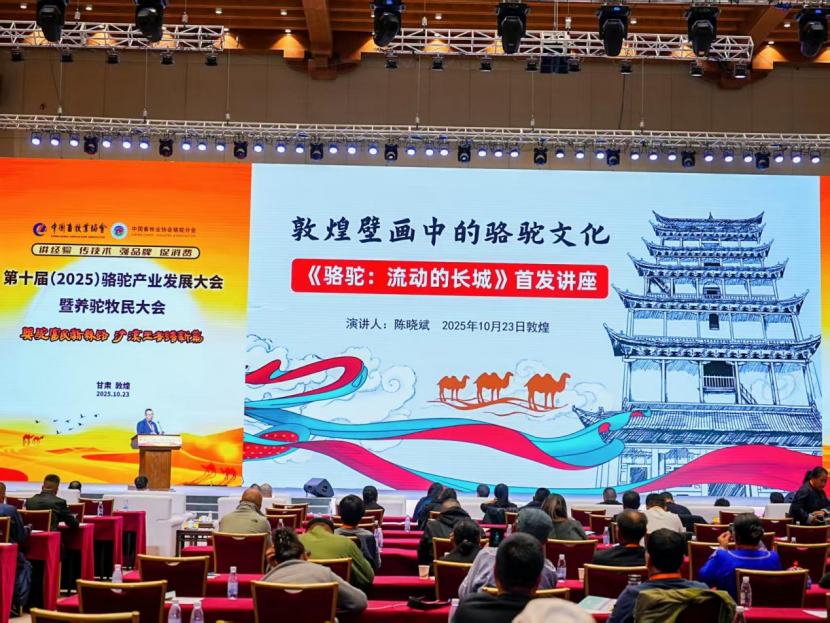 2025年10月22日至24日,在甘肃省敦煌市举办的全国“第十届(2025)骆驼产业发展大会”上,文化名家陈晓斌的新作《骆驼:流动的长城》正式发布。这部由敦煌文艺出版社出版发行的作品,全书三十万字,是国内首部纪实性讲述骆驼故事的著作,也是中国首部融合文学、历史、科普维度的骆驼主题书籍。在会上,陈晓斌做了题为“驼峰载文明,书香润产业”的主旨发言,与敦煌文艺出版社共同向多家企业代表赠书,并举办了题为《敦煌壁画中的骆驼文化》的书籍首发讲座。